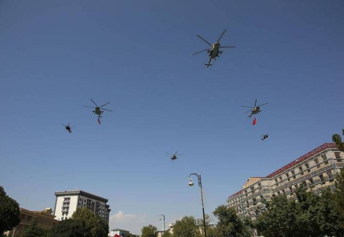 Helikopterlərin keçidi ilə Azərbaycan və Türkiyə Respublikalarının dövlət bayraqları nümayiş etdirilib. Bu zəfər bayramında ümummilli liderimiz Heydər Əliyevin “Bir millət, iki dövlət” dahi kəlamının fəlsəfəsi Azərbaycan-Türkiyə qardaşlığının sarsılmaz və əbədi olduğunu göstərir.