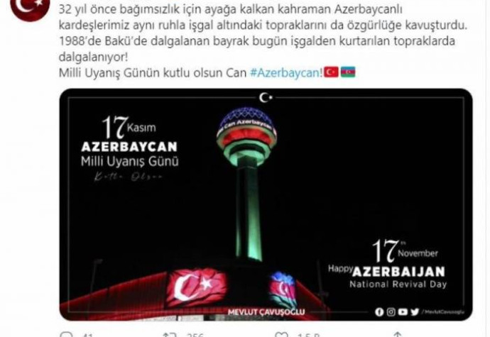 Türkiyənin xarici işlər naziri Mövlud Çavuşoğlu 17 noyabr – Milli Dirçəliş Günü münasibətilə Azərbaycan xalqına səmimi təbriklərini çatdırıb.