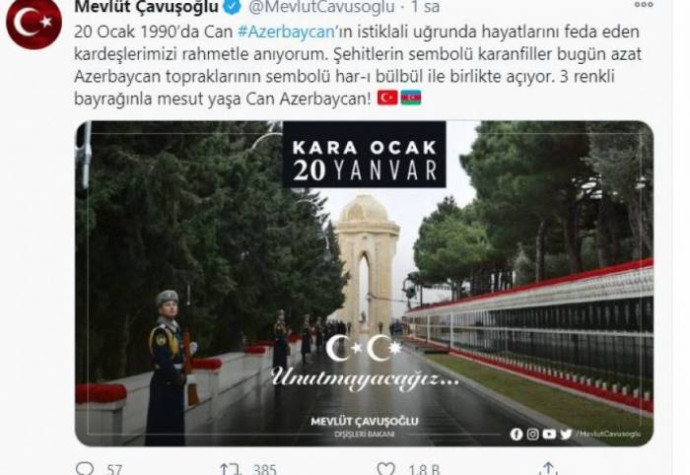 M.Çavuşoğlu 20 Yanvar faciəsi ilə bağlı fikirlərini belə ifadə edib: “Şəhidlərin xatirə rəmzi olan qərənfillər bu gün müstəqil Azərbaycan torpaqlarında azadlıq simvolu olan Xarı bülbüllə birlikdə açır. Üçrəngli bayrağınla məsud yaşa Can Azərbaycan”.