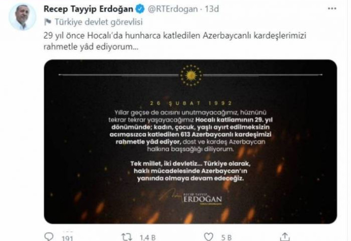 Türkiyə Prezidenti Rəcəb Tayyib Ərdoğanın “Twitter” sosial şəbəkə hesabında Xocalı soyqırımı qurbanlarına ehtiramı bu ifadə ilə başlayır.