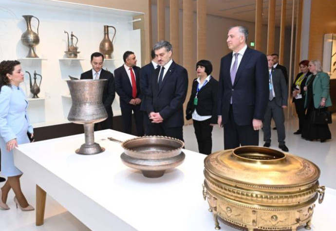 “Azərbaycan inciləri” sərgisi ilə də tanış olan Gürcüstan Prezidentinə bu sərgidə ölkəmizin tükənməz təbii sərvətləri, çoxəsrlik tarixi, mədəni irsi ilə bağlı nadir eksponatların nümayiş etdirildiyi bildirilib. Burada qədim peşələrin, o cümlədən Azərbaycan xalçaçılıq məktəbinin nadir nümunələri sərgilənir, milli çalğı alətlərimizin orijinal şəkildə - səsli formada təqdim olunduğu diqqətə çatdırılıb. Qeyd olunub ki, Azərbaycan milli geyimlərinin, qədim sikkələrin nümayiş etdirildiyi sərgiyə gələnlər burada müxtəlif dillərdə müqəddəs kitabları da görə bilərlər.