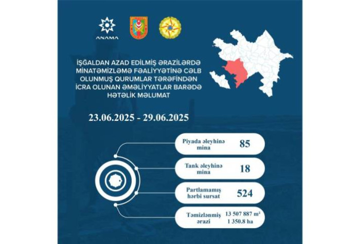 Azərbaycan Respublikasının Minatəmizləmə Agentliyi (ANAMA) işğaldan azad edilmiş ərazilərdə minatəmizləmə fəaliyyətinə cəlb olunmuş qurumlar tərəfindən 23-29 iyun tarixlərində icra edilən minatəmizləmə əməliyyatlarına dair məlumatı açıqlayıb.