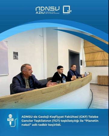 Azərbaycan Dövlət Neft və Sənaye Universitetinin (ADNSU) Geoloji kəşfiyyat fakültəsində tələbələr üçün “Planetin nəbzi” adlı maarifləndirici və interaktiv tədbir təşkil olunub. Tədbir ADNSU Tələbə Gənclər Təşkilatı-nın təşkilati dəstəyi ilə həyata keçirilib.