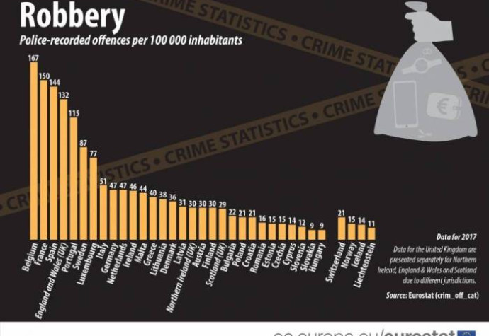 Qeyd olunur ki, 2011-ci ildən 2017-ci ilə kimi Avropa İttifaqında qarət hallarının sayı 24 faiz azalıb və 522 min hadisədən 396 min hadisəyə enib. Bununla yanaşı, təkcə 2017-ci ildə Avropadakı hücumların sayı 1,1 milyonu keçib. Ən çox qəsdən öldürmə halları Latviya, Litva, Estoniya və Maltada, ən az isə Lüksemburq, Çexiya, İtaliya və Avstriyada qeydə alınıb.