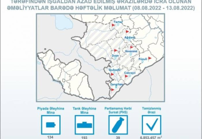 ANAMA-dan bildiriblər ki, avqustun 8-dən 13-dək Tərtər, Ağdam, Şuşa, Xocavənd, Füzuli, Qubadlı, Cəbrayıl və Zəngilan rayonlarının ərazilərində aparılmış minatəmizləmə əməliyyatları zamanı piyada əleyhinə 134, tank əleyhinə 193 mina və 39 ədəd partlamamış hərbi sursat aşkarlanaraq zərərsizləşdirilib.