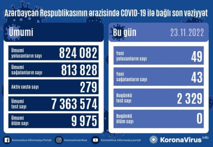 Azərbaycan Respublikasında koronavirus (COVID-19) infeksiyasına 49 yeni yoluxma faktı qeydə alınıb, 43 nəfər müalicə olunaraq sağalıb.