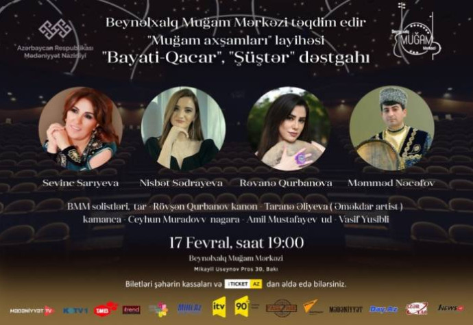 Mərkəzdən bildirilib ki, fevralın 17-nə planlaşdırılan musiqi gecəsində “Bayatı Qacar” və “Şüştər” muğamlarını Sevinc Sarıyeva, Nisbət Sədrayeva, Rəvanə Qurbanova və Məmməd Nəcəfov oxuyacaqlar.