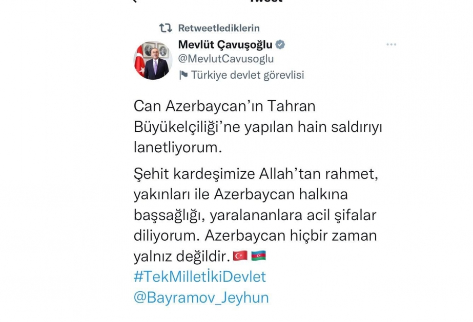 Çavuşoğlu qeyd edib: “Şəhid qardaşımıza Allahdan rəhmət, yaxnlarına və Azərbaycan xalqına başsağlığı, yaralananlara tezliklə şəfa tapmalarını diləyirəm. Azərbaycan heç zaman tək deyil. Azərbaycan və Türkiyə bir millət, iki dövlətdir”.