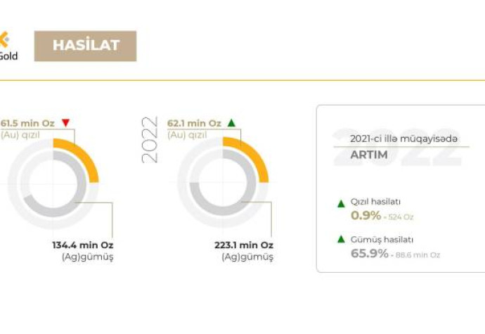 səmərəliliyinin yüksəldilməsi və istehsalat proseslərinin optimallaşdırılması üzrə fəaliyyətini uğurla davam etdirib. Məhz bunun nəticəsidir ki, hesabat ilində hasilat göstəriciləri 62.1 min unsiya qızıl, 223.1 min unsiya gümüşə çatdırılıb. Beləliklə, 2021-ci illə müqayisədə 2022-ci ildə qızıl hasilatı 524 unsiya (0.9%), gümüşdə 88.6 min unsiya (65.9%) çox olub. 2017 – 2022-ci illər üzrə cəmi göstərici isə 318 min unsiya qızıl və 711 min unsiya gümüş təşkil edib. 2023-cü ildə isə 62.5 min unsiya qızıl, 108.3 min unsiya gümüşün hasil edilməsi hədəf olaraq müəyyən edilib.