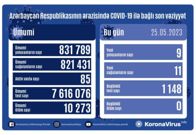 Azərbaycanda indiyədək ümumilikdə 831 789 nəfər koronavirus infeksiyasına yoluxub. Onlardan 821 431 nəfər müalicə olunaraq sağalıb, 10 273 nəfər vəfat edib, aktiv xəstə sayı 85 nəfərdir.
