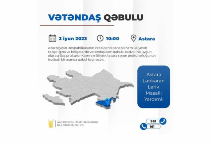 Azərbaycan Respublikasının Prezidenti İlham Əliyevin tapşırığına və bölgələrdə vətəndaşların qəbulu cədvəlinə uyğun olaraq Baş prokuror Kamran Əliyev iyunun 2-də, saat 10:00-da Astara Rayon Prokurorluğunun inzibati binasında Astara, Masallı, Yardımlı, Lənkəran və Lerik rayon sakinləri ilə görüşəcək.