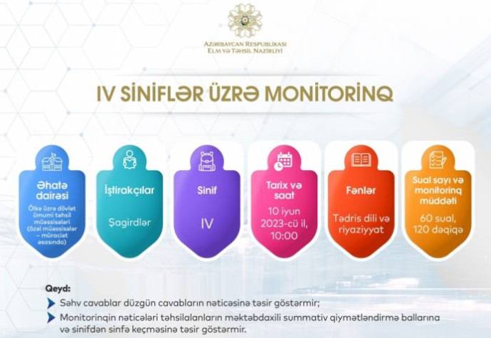 İyunun 10-da Elm və Təhsil Nazirliyi tərəfindən ölkə üzrə bütün dövlət ümumi təhsil müəssisələrinin 4-cü siniflərində monitorinq təşkil olunacaq. Monitorinq tədris dili və riyaziyyat fənləri üzrə aparılacaq.