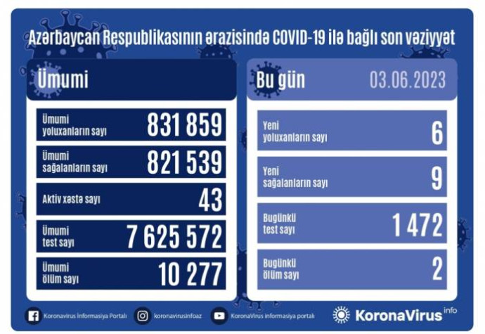 Son sutkada yeni yoluxma hallarının müəyyənləşdirilməsi ilə əlaqədar 1472, bu günə qədər isə ümumilikdə 7 milyon 625 min 572 test icra olunub.