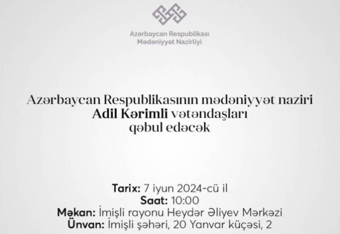 Azərbaycan Respublikasının mədəniyyət naziri Adil Kərimli tərəfindən cari ilin aprel ayında nəzərdə tutulmuş Beyləqan, İmişli, Saatlı, Sabirabad rayonlarından olan vətəndaşların qəbulu iyunun 7-də saat 10:00-da İmişli rayonu Heydər Əliyev Mərkəzində (Ünvan: İmişli şəhəri, 20 Yanvar küçəsi 2) keçiriləcək.