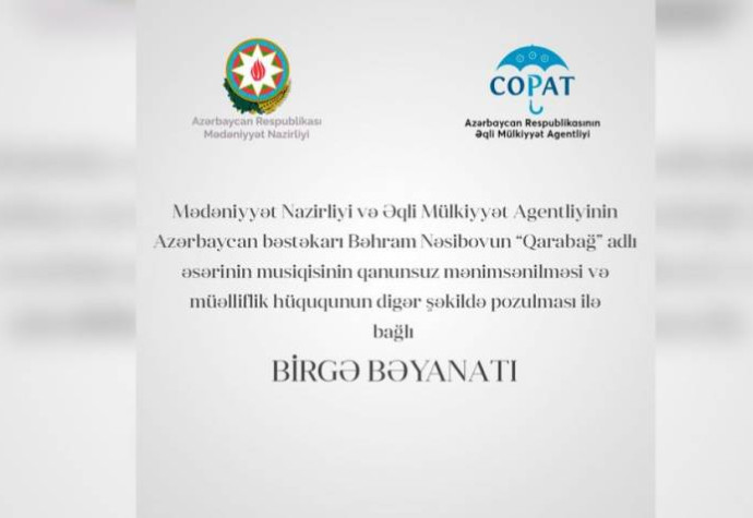 Mədəniyyət Nazirliyi Azərbaycan Respublikasının Əqli Mülkiyyət Agentliyi ilə birgə Azərbaycan bəstəkarı Bəhram Nəsibovun “Qarabağ” adlı əsərinin musiqisinin qanunsuz mənimsənilməsi və müəlliflik hüququnun digər şəkildə pozulması ilə bağlı bəyanat yayıb.