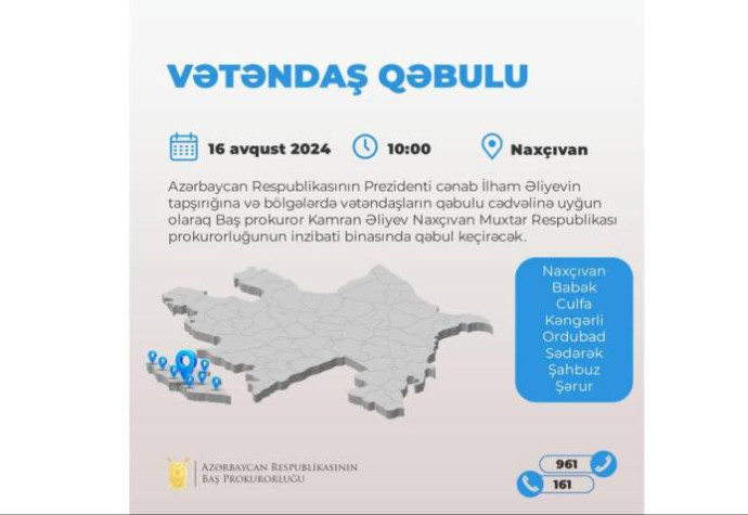 Prezident İlham Əliyevin tapşırığına və bölgələrdə vətəndaşların qəbulu cədvəlinə uyğun olaraq Baş prokuror Kamran Əliyev avqustun 16-da saat 10:00-da Naxçıvan Muxtar Respublikası prokurorluğunun inzibati binasında Naxçıvan şəhər, Babək, Culfa, Kəngərli, Ordubad, Sədərək, Şahbuz və Şərur rayon sakinləri ilə görüşəcək.