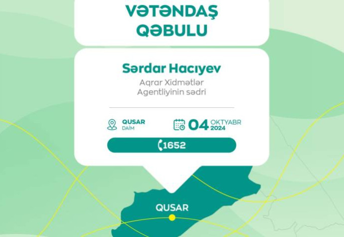 Aqrar Xidmətlər Agentliyinin sədri Sərdar Hacıyev oktyabrın 4-də, saat 10:00-da Qusar Dövlət Aqrar İnkişaf Mərkəzinin inzibati binasında vətəndaşları qəbul edəcək.