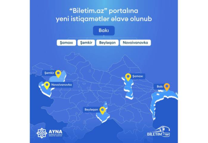 AYNA-dan bildirilib ki, “Biletim.az” portalına əlavə olunmuş yeni məntəqələr əsasında artıq Bakıdan Şəmkirə, Beyləqana və Gədəbəy rayonunun Novoivanovka kəndinə yollanmaq istəyən sərnişinlər avtobuslara bileti onlayn ala bilərlər.