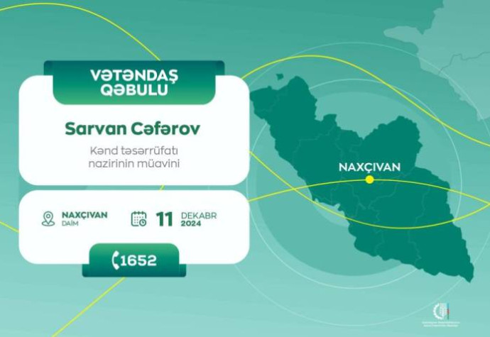 Kənd təsərrüfatı nazirinin müavini Sarvan Cəfərov dekabrın 11-də, saat 10:00-da Naxçıvan Kənd Təsərrüfatı Elmi-Tədqiqat İnstitutunun inzibati binasında (ünvan: Naxçıvan şəhəri, Xətai məhəlləsi) Naxçıvan şəhəri, Babək, Culfa, Kəngərli, Ordubad, Sədərək, Şahbuz və Şərur rayonlarından olan vətəndaşları qəbul edəcək.