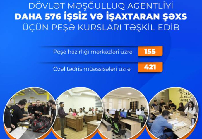Nazirliyin İctimaiyyətlə əlaqələr şöbəsindən bildirilib ki, onlardan 155 nəfəri üçün Agentliyin Bakı, Gəncə, Göyçay və Qarabağ Peşə Hazırlığı Mərkəzlərində, 421 nəfəri üçün isə özəl tədris müəssisələrində peşə kursları təşkil olunub.