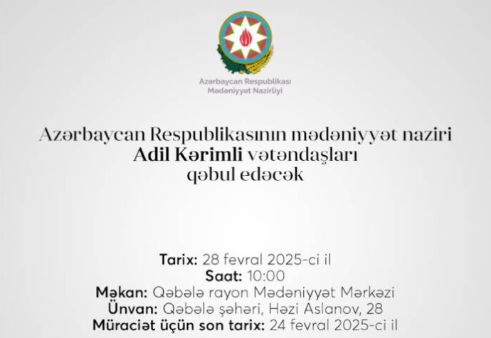 Mərkəzi icra hakimiyyəti orqanları və digər idarəetmə qurumlarının rəhbərlərinin şəhər və rayonlarda vətəndaşların qəbulu cədvəlinə əsasən mədəniyyət naziri Adil Kərimli fevralın 28-də saat 10:00-da Qəbələ rayon Mədəniyyət Mərkəzində (ünvan: Qəbələ şəhəri, Həzi Aslanov, 28) Qəbələ, Şəki, Oğuz, Qax, Zaqatala və Balakən rayonlarından olan vətəndaşlarla görüşəcək.