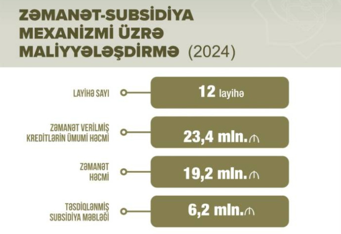 2024-cü ildə bu ərazilərdə sahibkarların zəmanət-subsidiya mexanizminə müraciətləri əsasında 12 layihə üzrə 23,4 milyon manat kreditə 19,2 milyon manat dövlət zəmanəti verilib. Həmçinin bu kreditlər üzrə 6,2 milyon manat həcmində subsidiyanın verilməsi təsdiqlənib. Fond tərəfindən bu mexanizmlə maliyyələşdirilən layihələr sənaye, xidmət, turizm və kənd təsərrüfatı sahələrini əhatə edib. Sözügedən layihələr Şuşa, Xankəndi, Ağdam, Cəbrayıl və Xocalıda fəaliyyət göstərərək iqtisadiyyata töhfə verirlər.