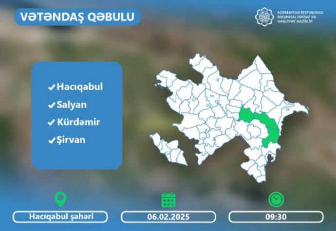Rəqəmsal inkişaf və nəqliyyat naziri Rəşad Nəbiyev 6 fevral 2025-ci il tarixində saat 09:30-da Hacıqabul şəhərində yerləşən Heydər Əliyev Mərkəzində Salyan, Kürdəmir, Hacıqabul rayonları və Şirvan şəhər sakinlərini qəbul edəcək.