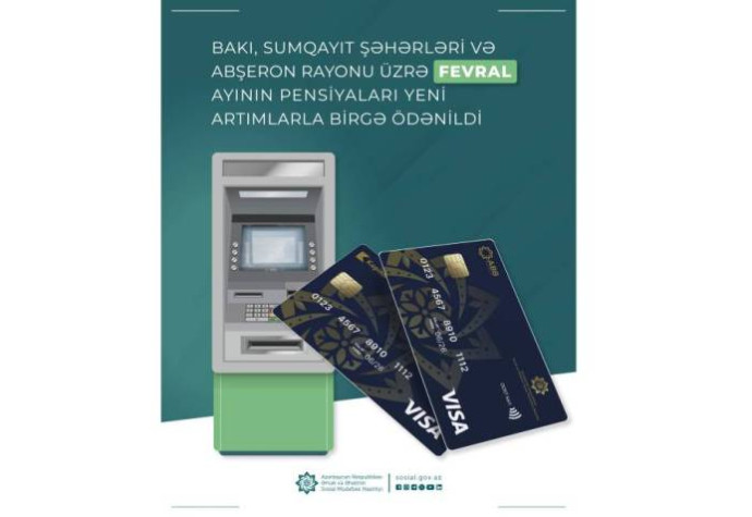 Əmək və Əhalinin Sosial Müdafiəsi Nazirliyinin tabeliyindəki Dövlət Sosial Müdafiə Fondu tərəfindən Bakı, Sumqayıt şəhərləri və Abşeron rayonu üzrə fevral ayının pensiyaları ödənilib.