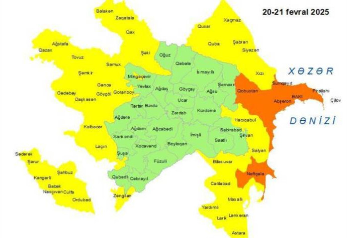 Milli Hidrometeorologiya Xidməti fevralın 20-21-də Bakıda və Abşeron yarımadasında, eyni zamanda, bəzi bölgələrdə gözlənilən küləkli hava şəraiti ilə bağlı sarı və narıncı xəbərdarlıqlar verib.