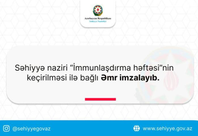 Azərbaycanın səhiyyə naziri Teymur Musayev aprelin 27-dən mayın 3-dək respublikanın bütün şəhər və rayonlarında “İmmunlaşdırma həftəsi”nin keçirilməsi ilə bağlı əmr imzalayıb.