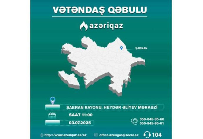 SOCAR-ın “Azəriqaz” İB-nin baş direktorunun Şabran rayonunda vətəndaş qəbulu iyulun 3-də saat 11:00-da Heydər Əliyev Mərkəzində reallaşacaq.